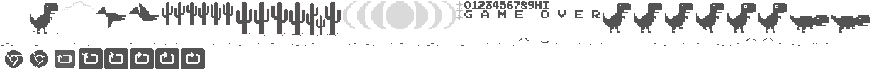 Jogo do Dino. Um dinossauro pixelizado desvia de cactos e pterodáctilos enquanto corre por uma paisagem desolada. Quando ouvir um sinal sonoro, pressione espaço para pular sobre os obstáculos.